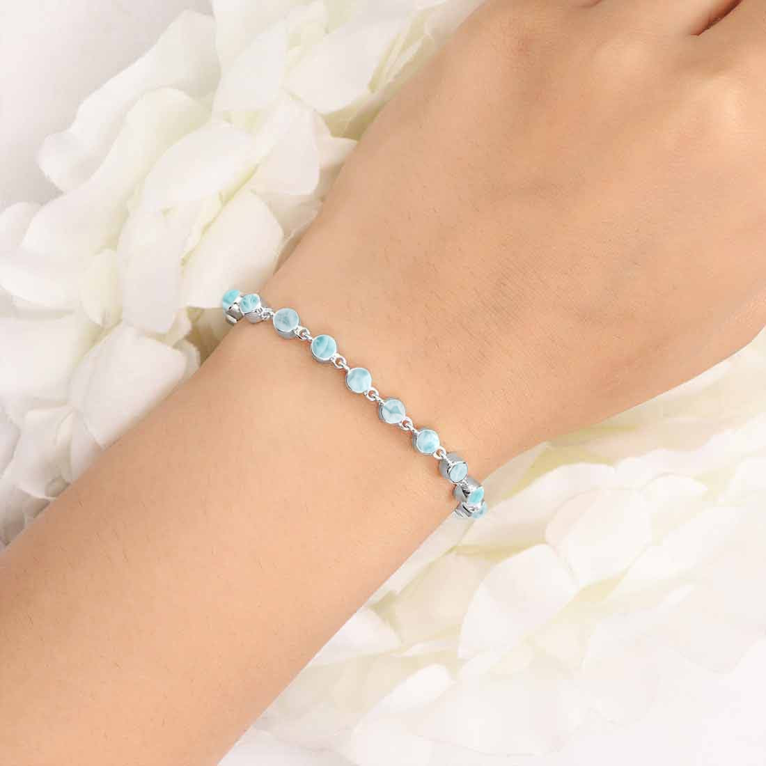 This Close Out Larimar Bracelet-(LAR-CO-RDB-116-CAB.) is curated with the sheer attention to detail to Close Outmpliment the wearer's wrist in the best possible way. The elegant design of this bracelet is something to fall for. It can be paired up with a wristwatch to take the overall appearance to a whole new level. A person's wrist is believed to be the path from which the stone's Close Outncentrated qualities & powers enter the body. Thus, it benefits the wearer to the maximum. Also, matching earrings can be worn with the bracelet to enhance it further. Wearing this bracelet will let the vibe spread. This bracelet Close Outmes with a promise and responsibility of making the wearer feel beautiful inside out. Larimar is a member of a ?silicate mineral? family that forms 90% of the earth?s crust and is used to curate beautiful larimar jewelry. With a silky shine, the white lines on turquoise blue larimar stone gives the appearance of a deep blue sea. The larimar stone used for curating jewelry at Rananjay Exports is authentically sourced from the Dominican Republic, in the Caribbean. These stones are then embedded in a 925 sterling silver setting to form the most beautiful jewelry for wholesale. It is symbolic of peace and clarity of mind that helps to cure, stress & anger issues, phobias, and panic attacks. Also, it balances the third eye, crown, throat, and heart chakras.