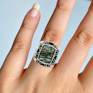 This Moss Agate Ring-(MOA-RDR-3272.) possesses this semi-precious stone's powers and qualities, thus benefiting the wearer in the most beautiful ways. And the best way to believe it is when the wearer experiences it herself. So, wearing this statement ring with the most elegant and matching outfit will uplift the wearer's whole appearance. Also, being very comfortable, it makes a perfect gift for people who love to wear accessories. It will give the wearer a new slant in life by promoting self-confidence and bringing out her innate capabilities to the surface. This bold ring is sure to be getting the wearer a lot of compliments.